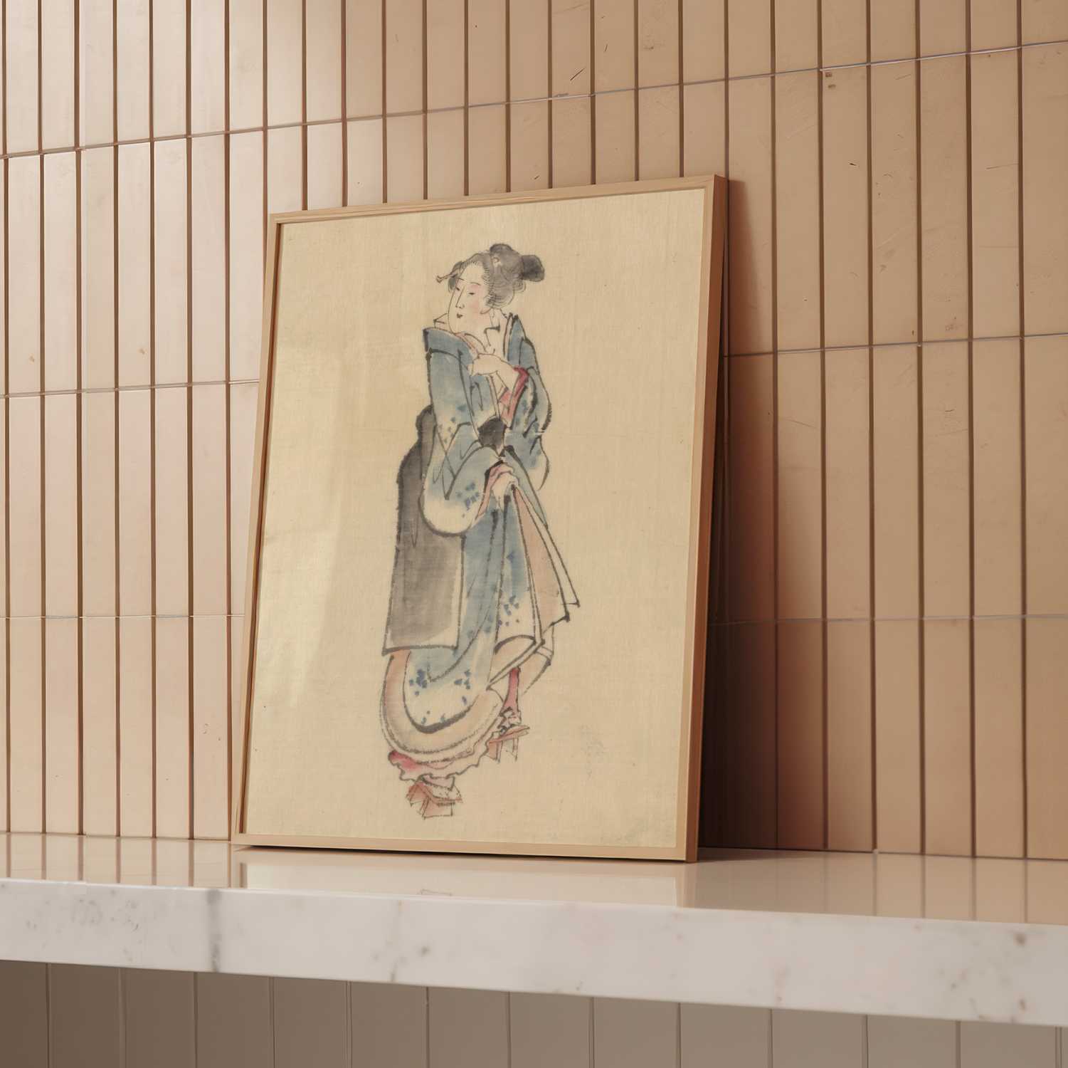 A quiet everyday scene capturing a solitary woman in motion. This print reflects Hokusai’s refined line work and focus on daily life in Edo-period Japan.