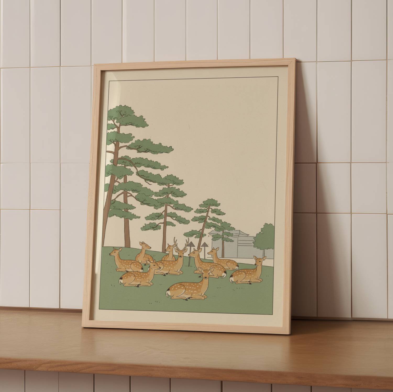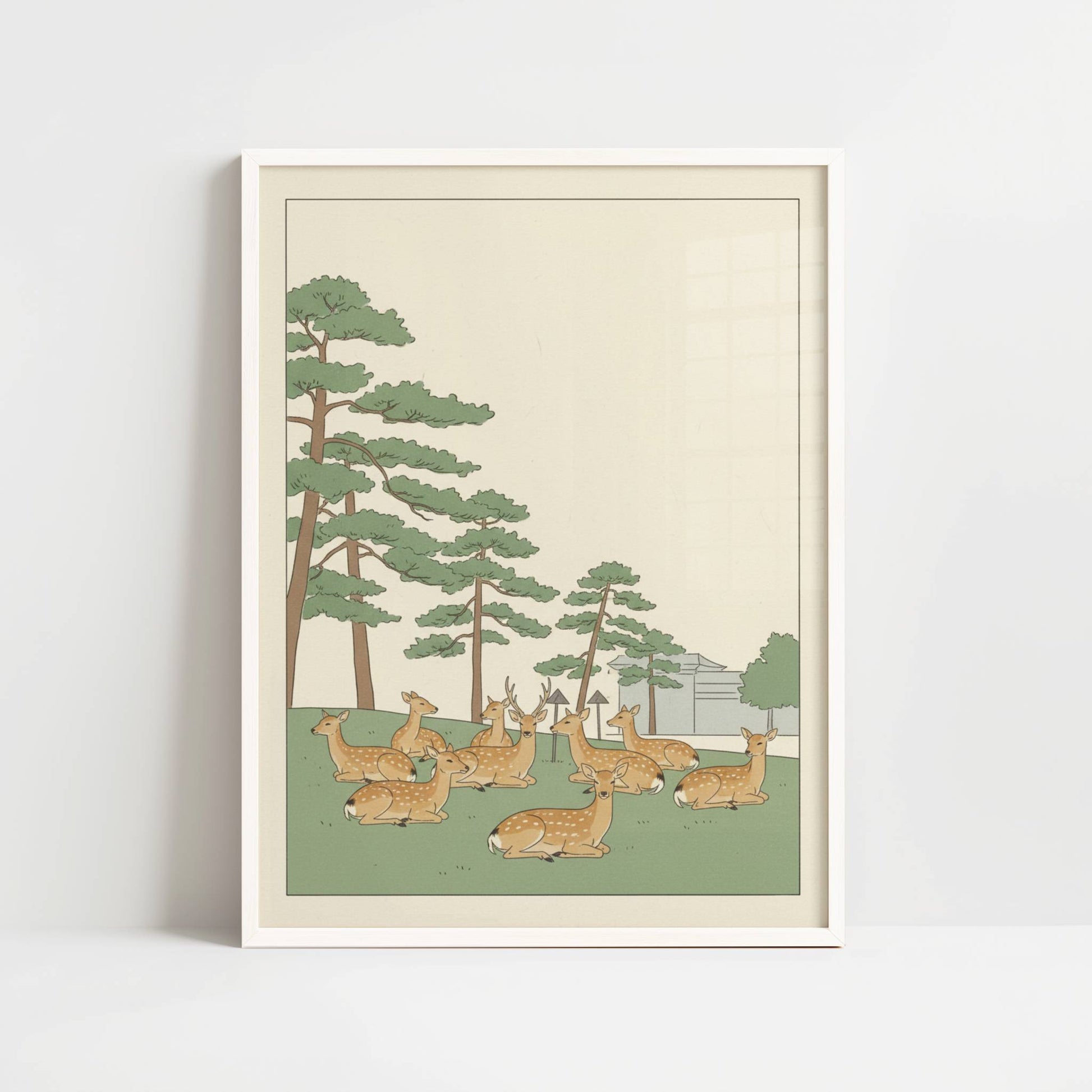 Deer rest freely among trees in Nara Park. Nature and city life coexist peacefully.