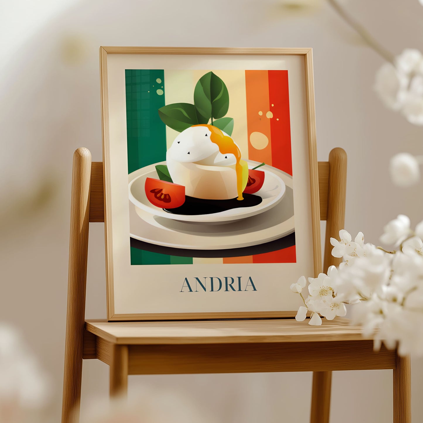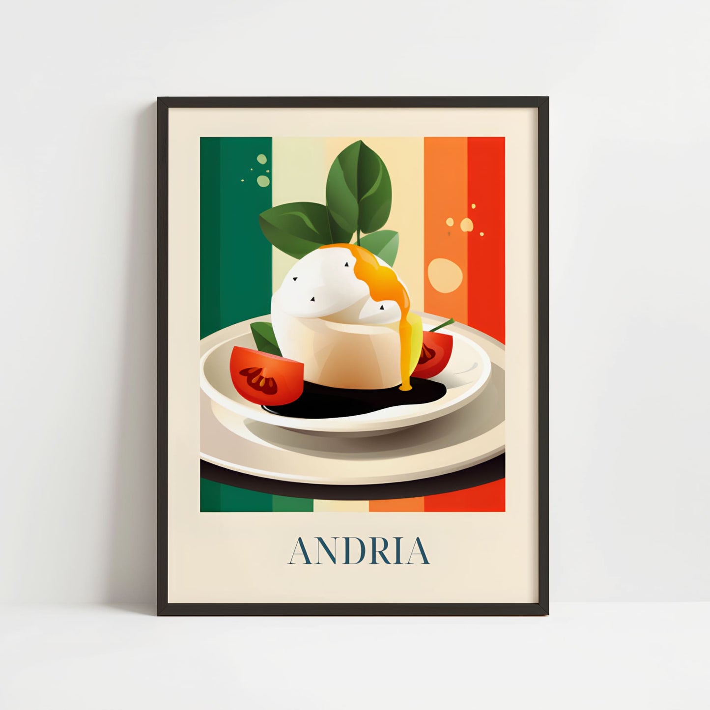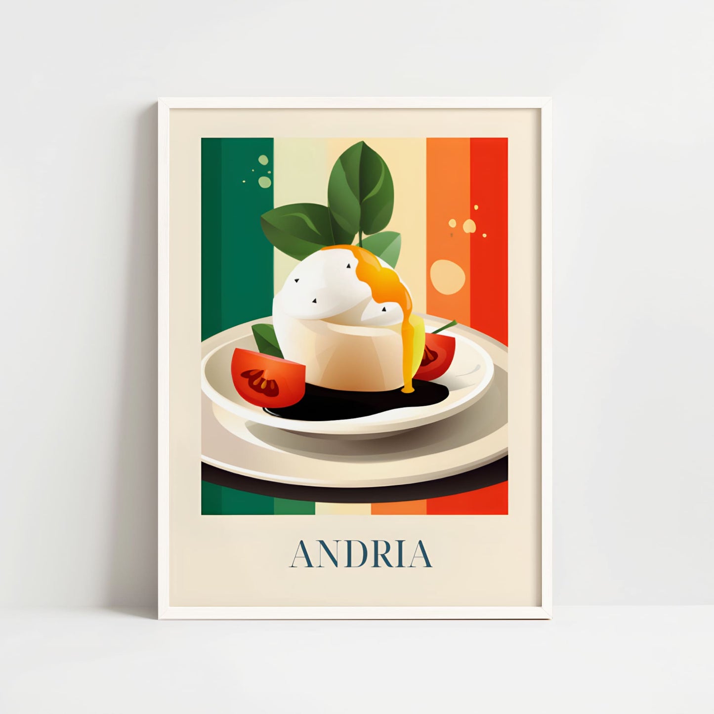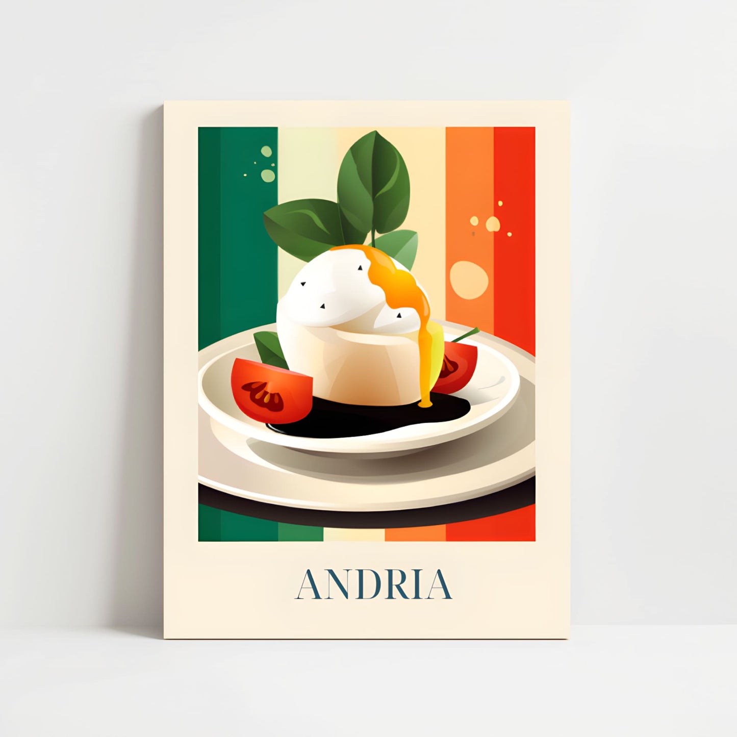 Celebrate the creamy elegance of Andria with this poster featuring burrata—fresh, delicate, and full of southern Italian soul. Inspired by olive groves, sunlit tables, and the artisanal cheese traditions of Puglia, this artwork brings a soft and luxurious taste of Italy into your home.