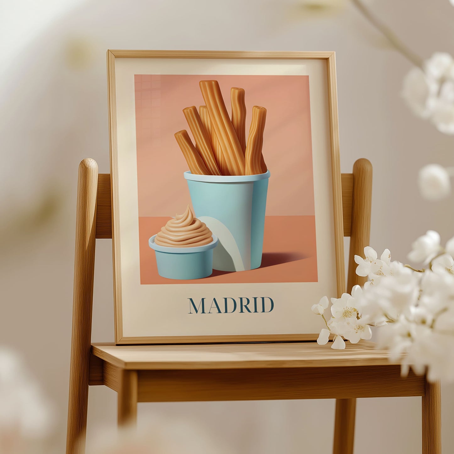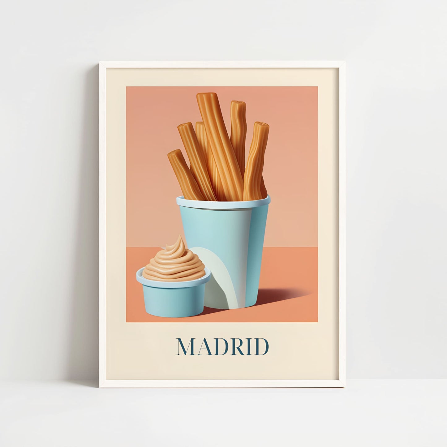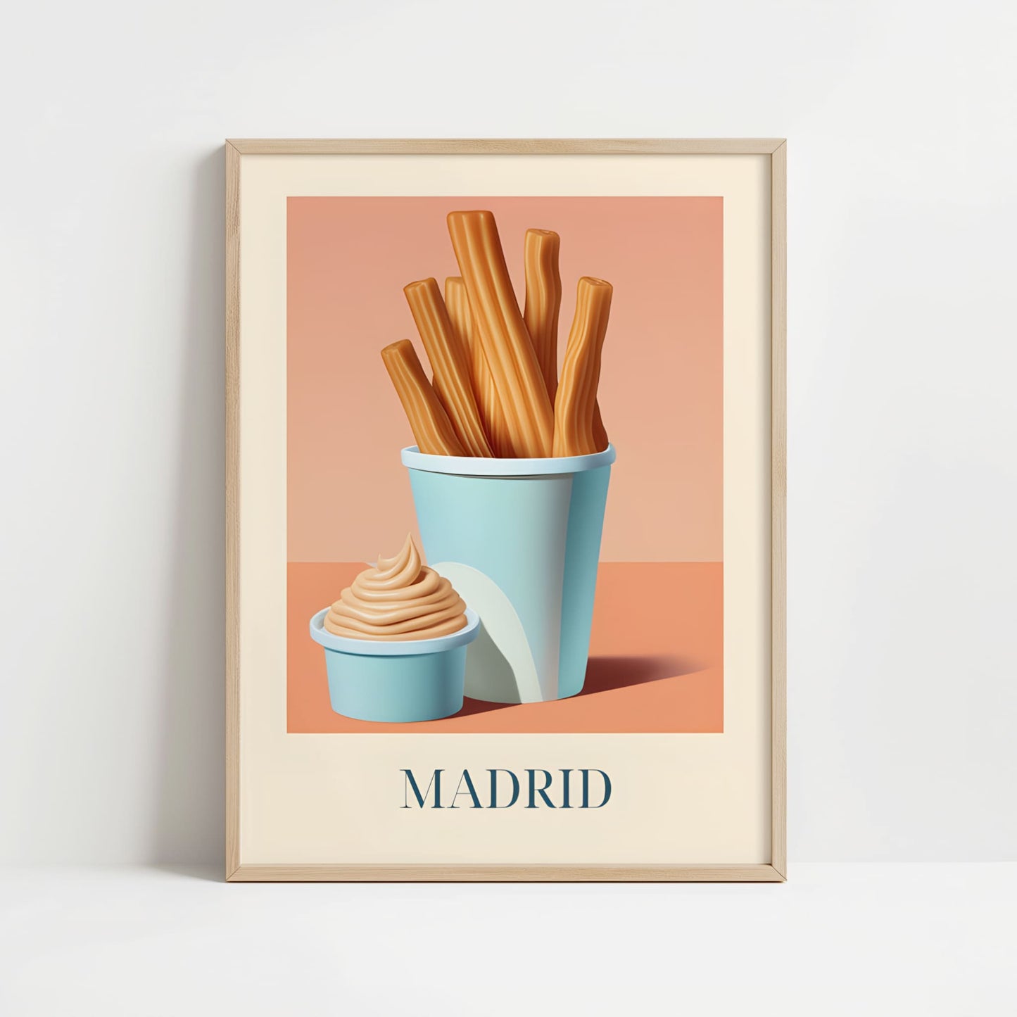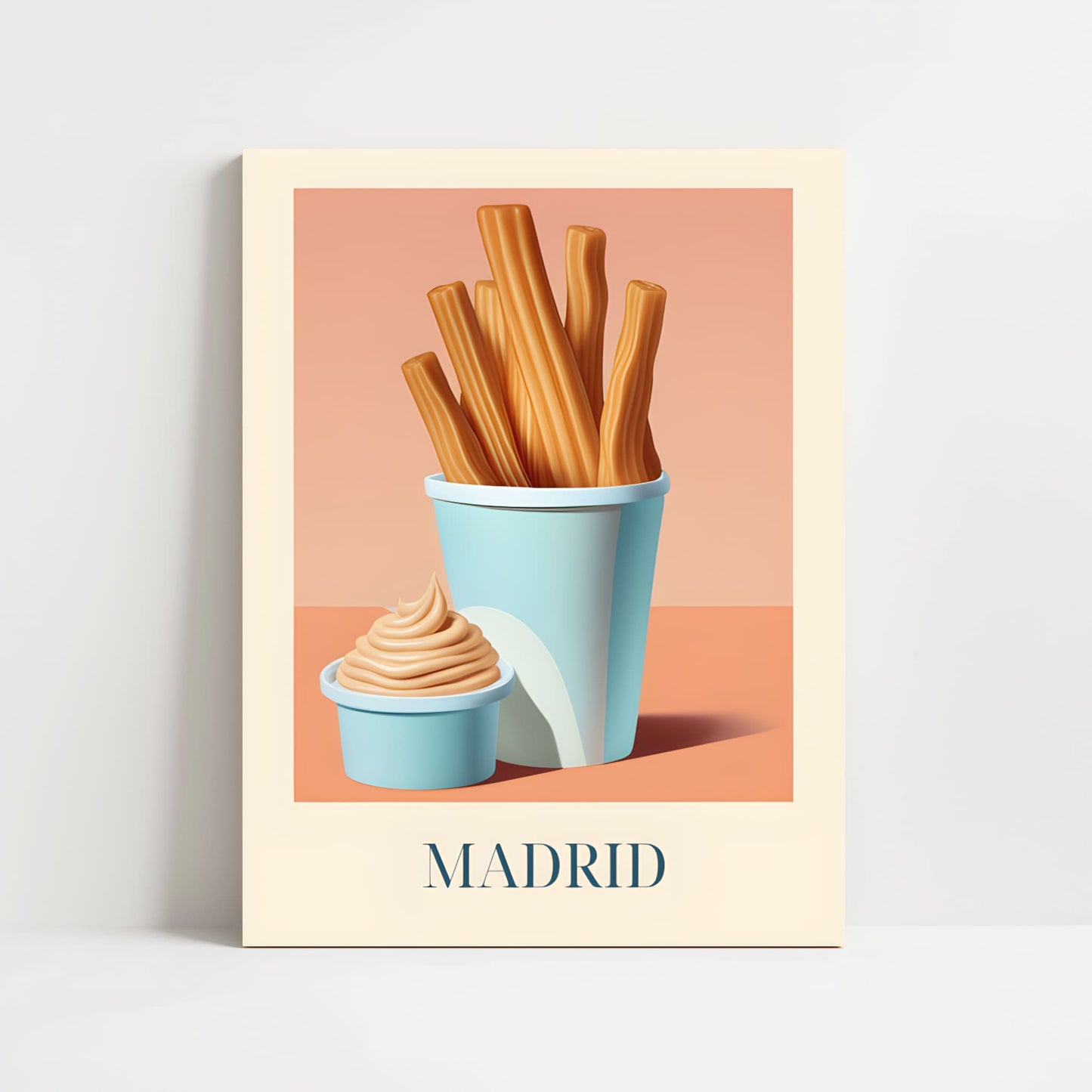 Celebrate the sweet spirit of Madrid with this poster featuring churros—golden, crispy, and perfect for dipping in rich chocolate. Inspired by lively cafés, morning treats, and the warmth of Spanish tradition, this artwork brings the cozy charm of Madrid into your home.