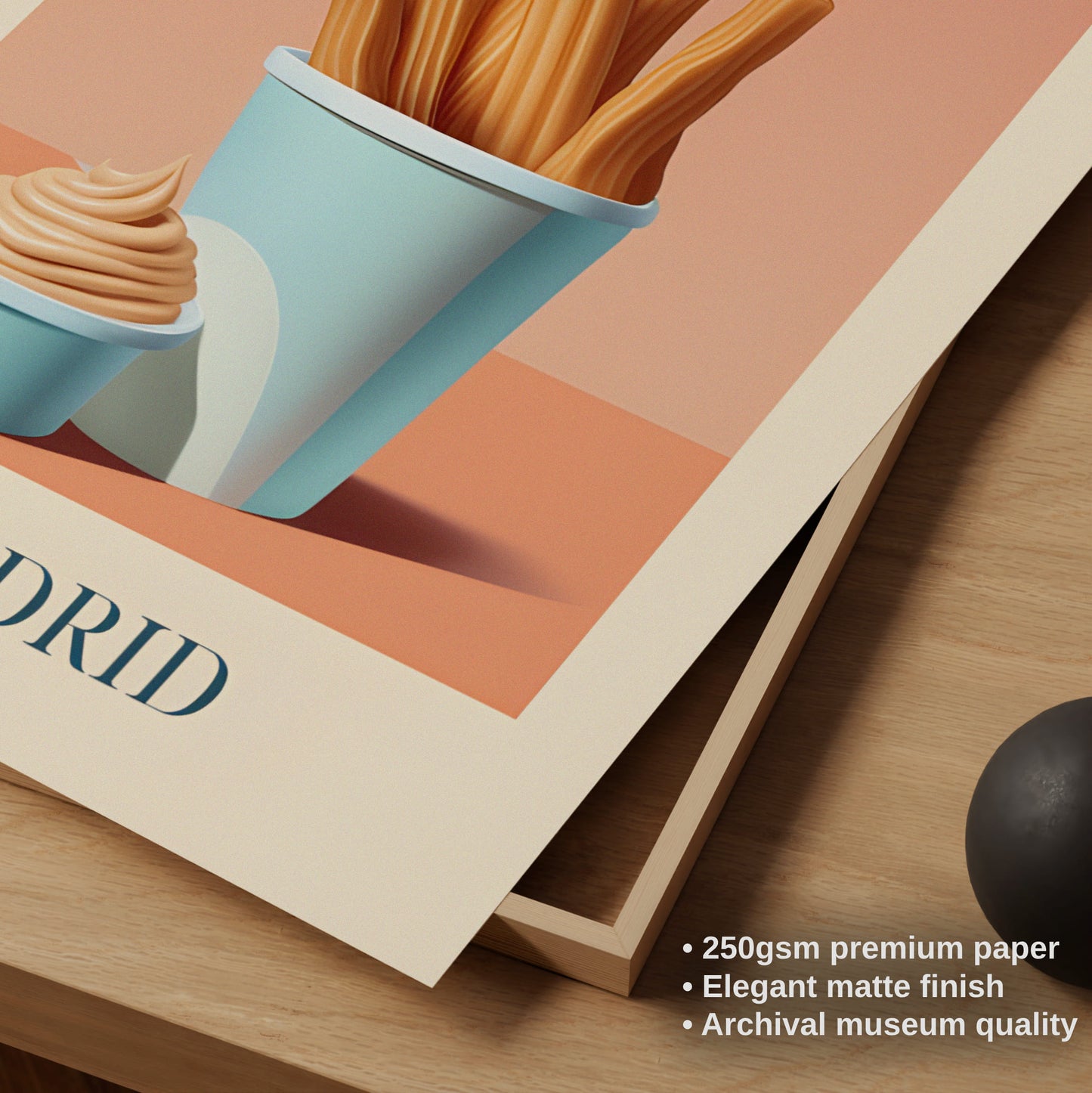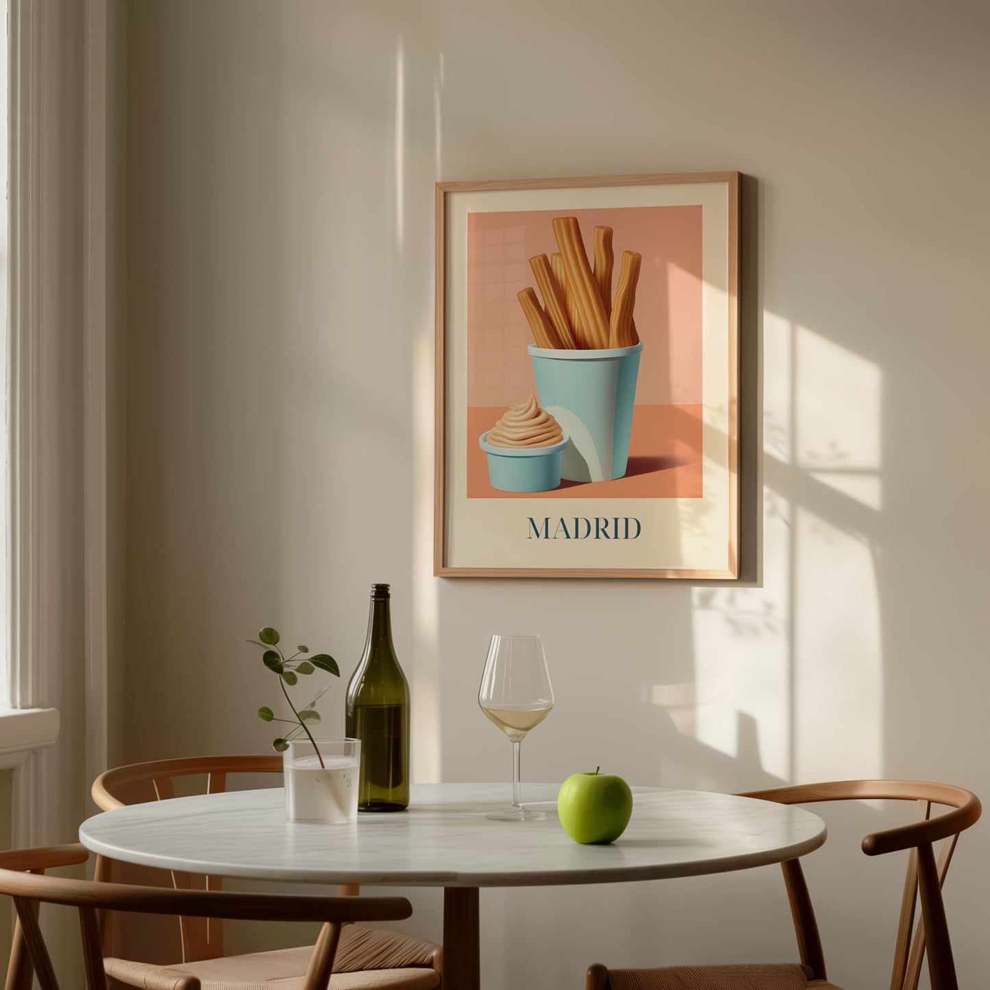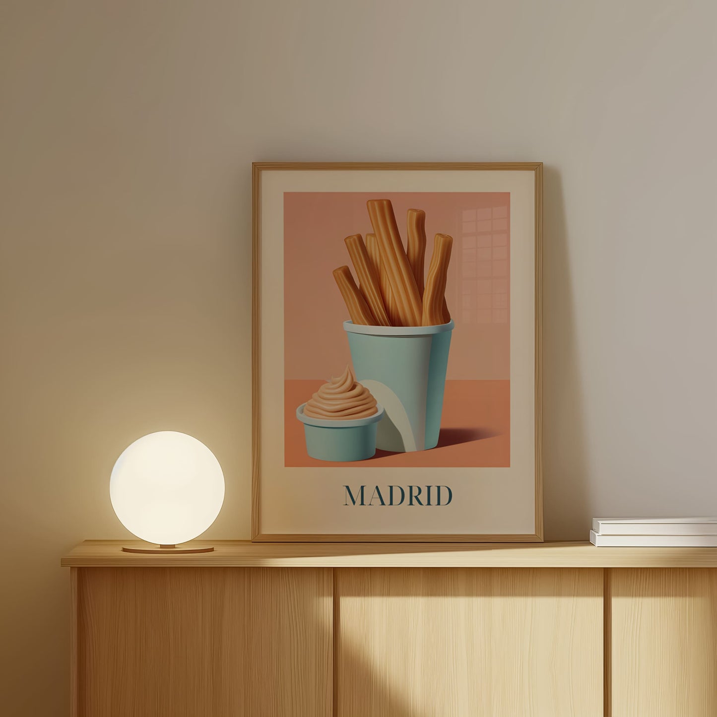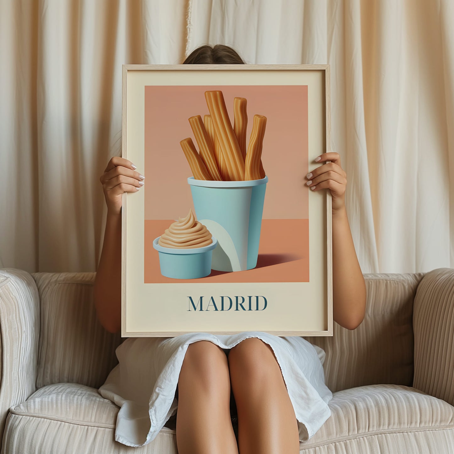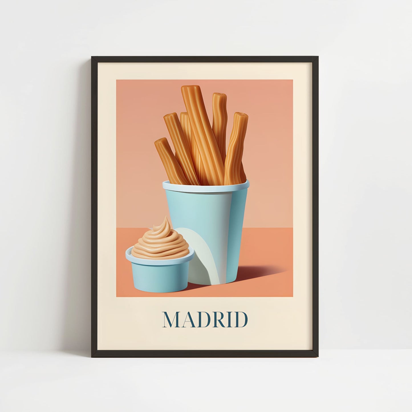 Celebrate the sweet spirit of Madrid with this poster featuring churros—golden, crispy, and perfect for dipping in rich chocolate. Inspired by lively cafés, morning treats, and the warmth of Spanish tradition, this artwork brings the cozy charm of Madrid into your home.