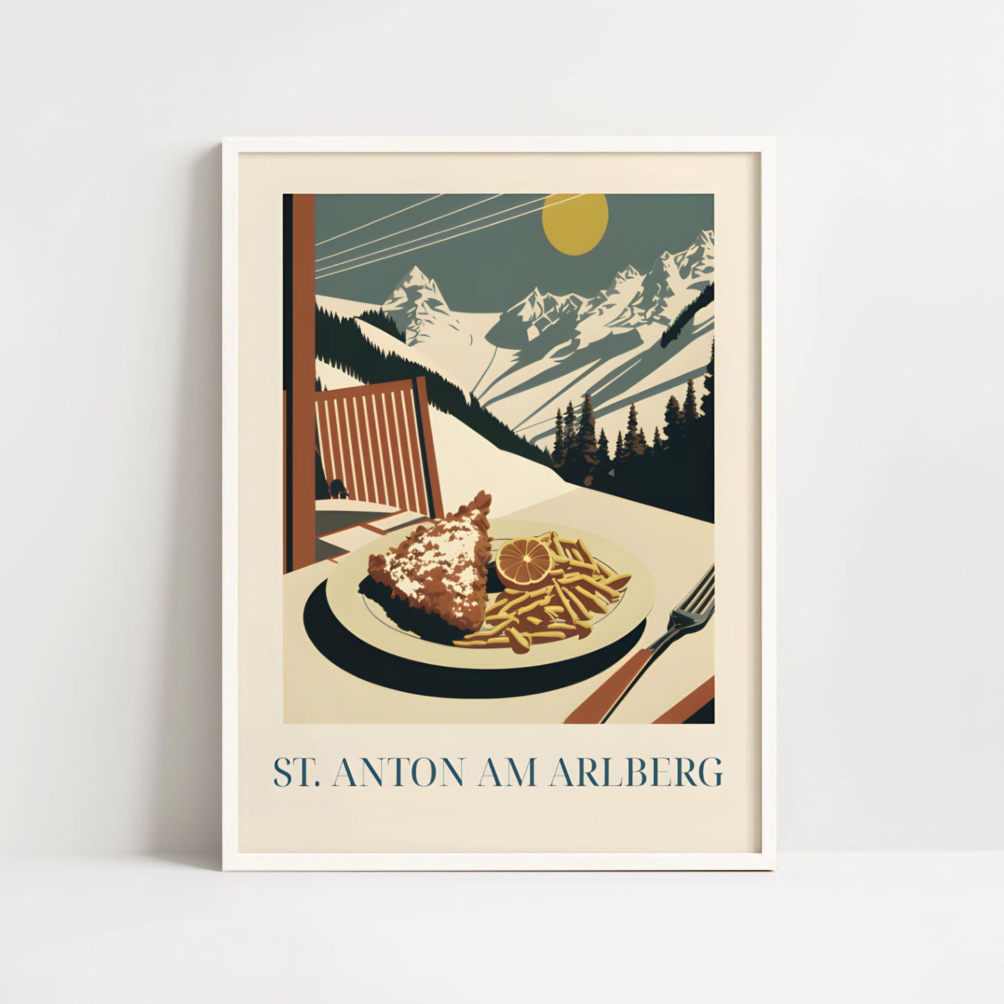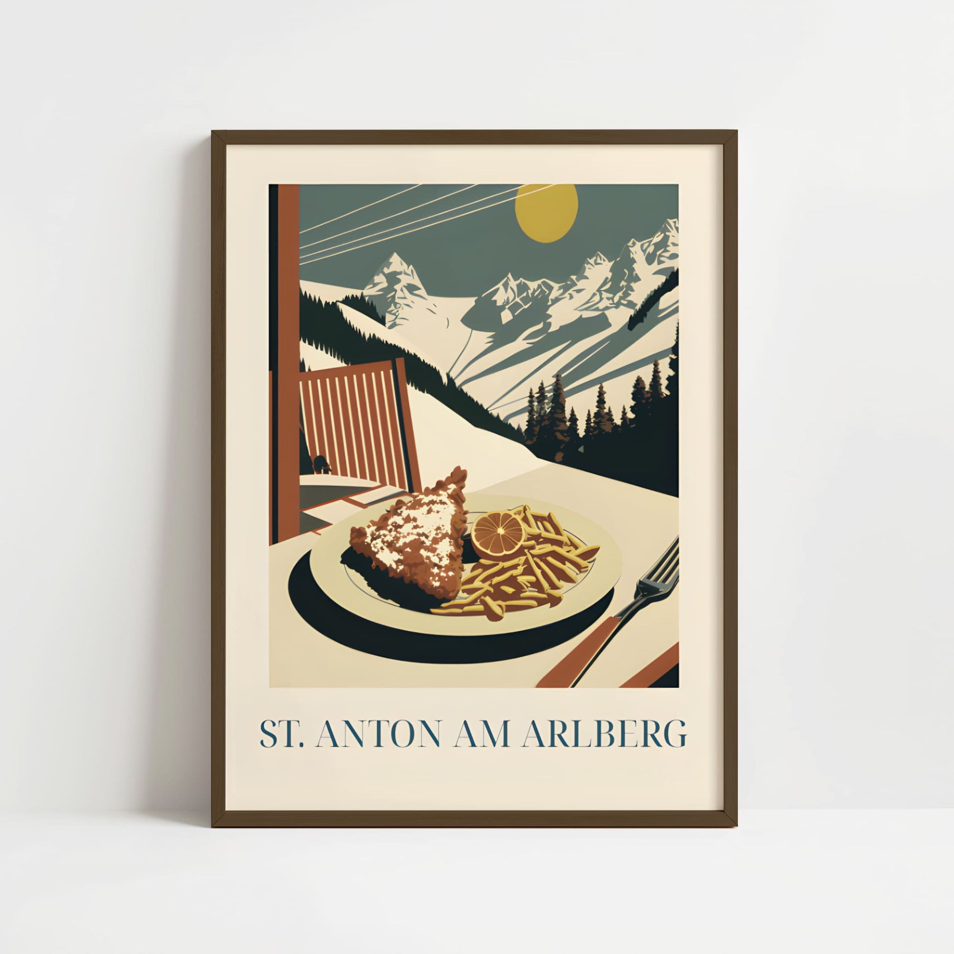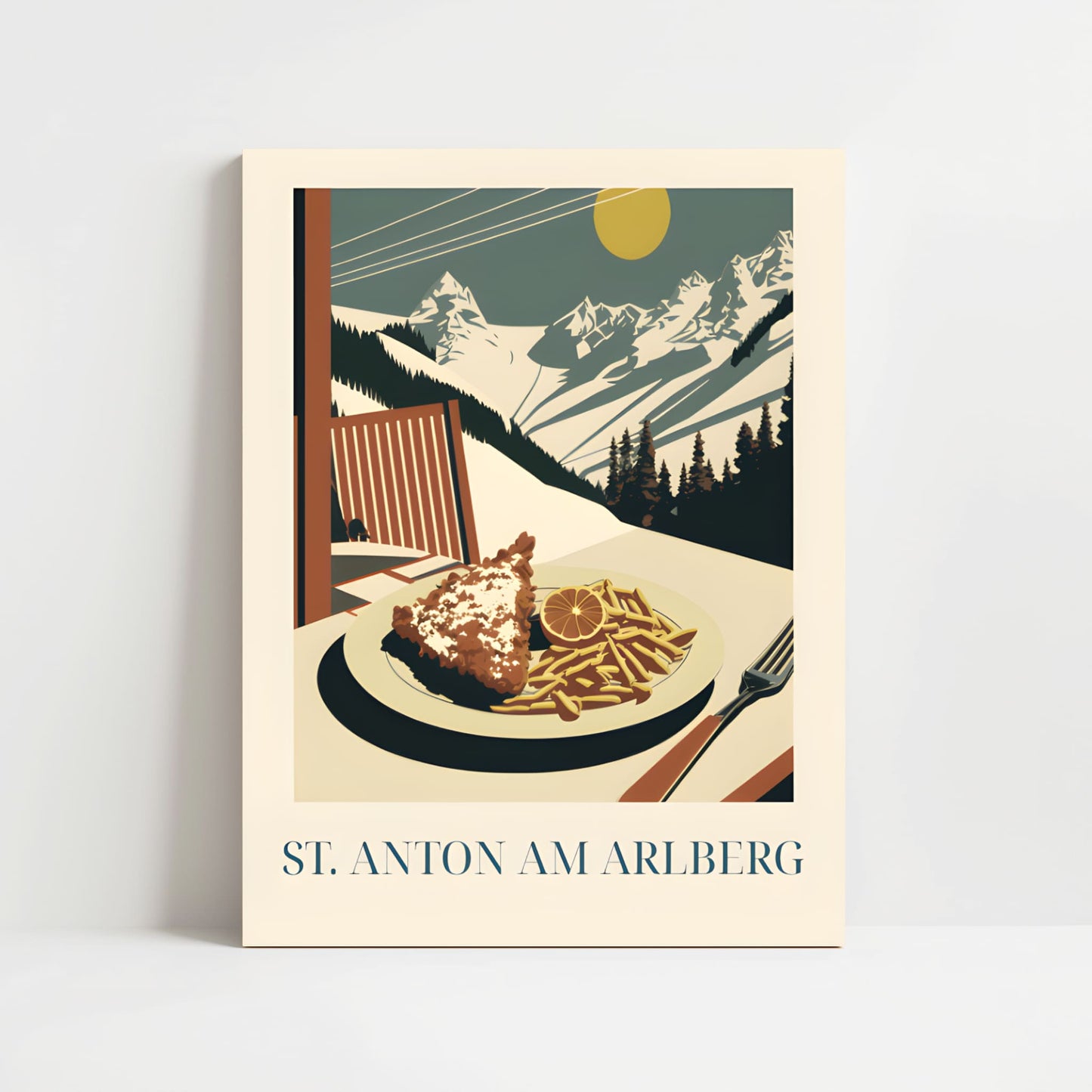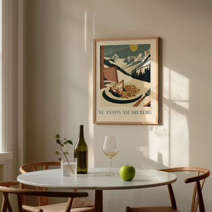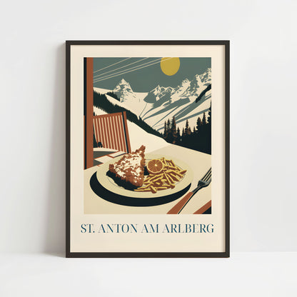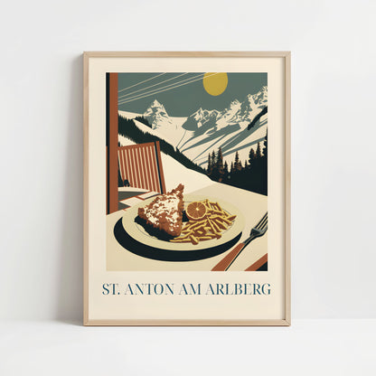 Celebrate the alpine comfort of St. Anton with this poster featuring schnitzel—crispy, golden, and rich in Austrian tradition. Inspired by mountain lodges, snowy slopes, and hearty après-ski meals, this artwork brings the warm, rustic charm of the Alps into your home.