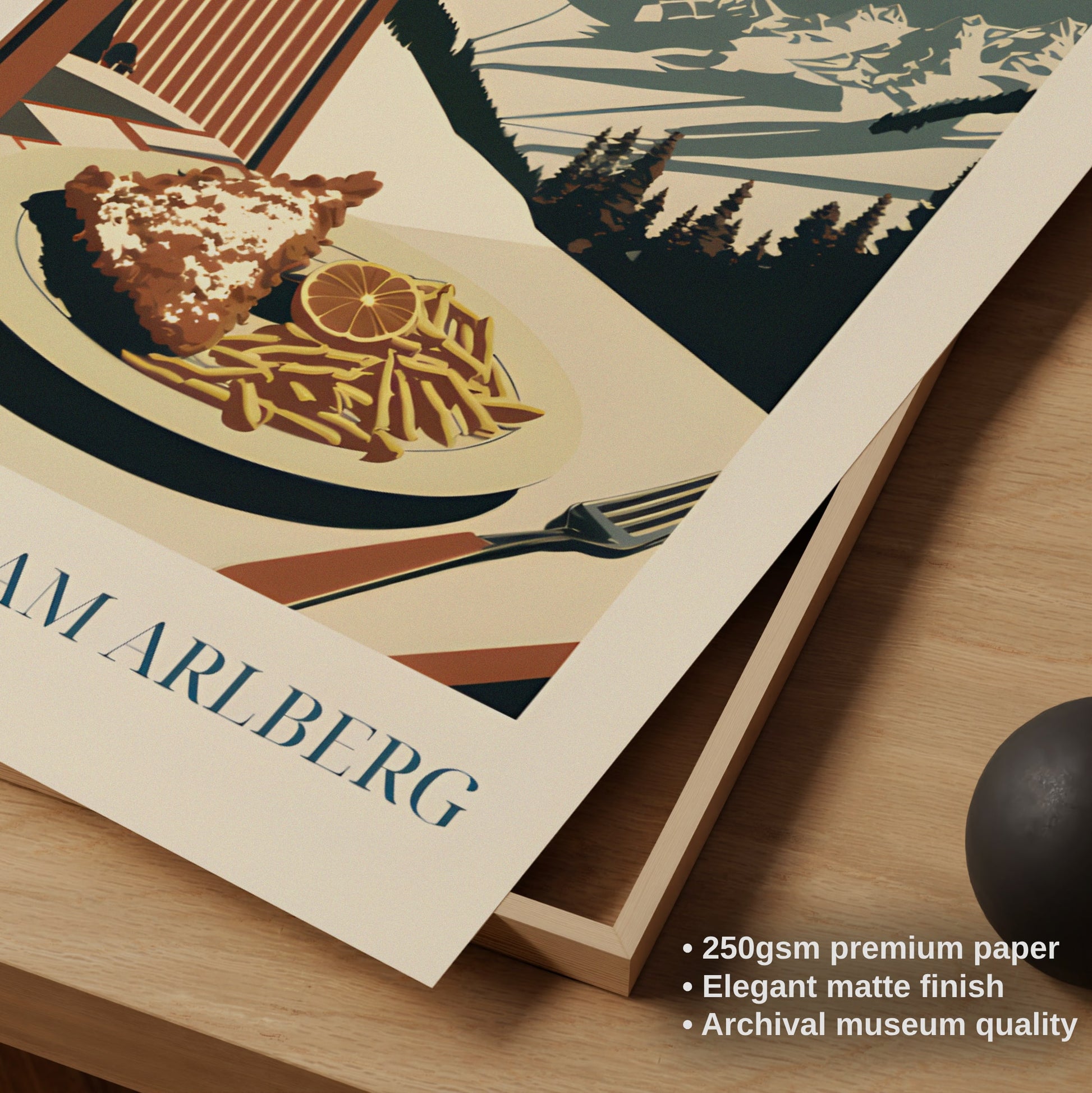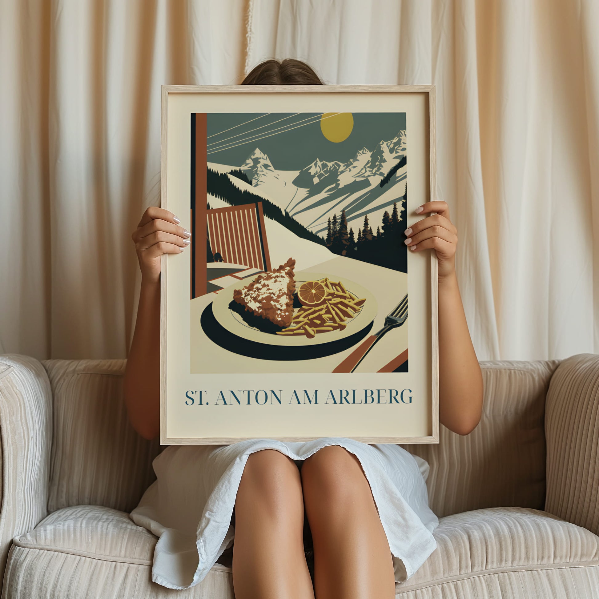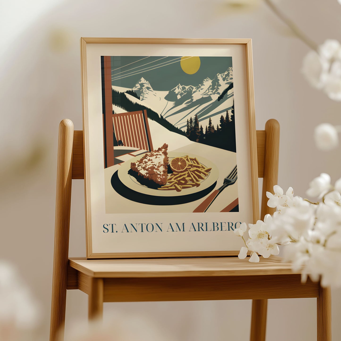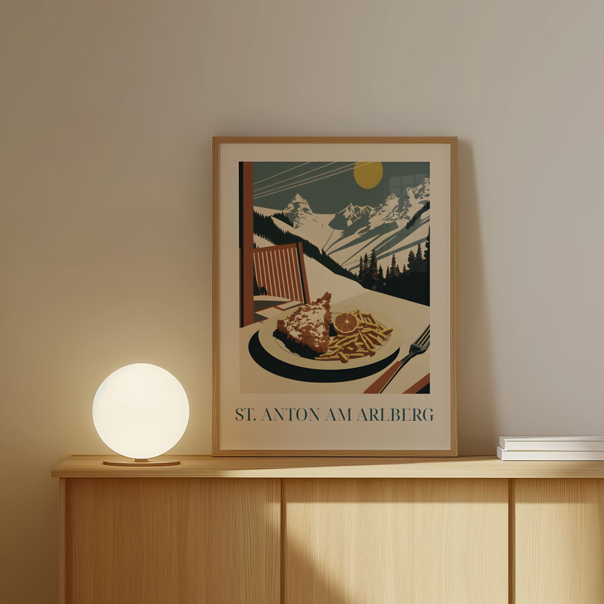 Celebrate the alpine comfort of St. Anton with this poster featuring schnitzel—crispy, golden, and rich in Austrian tradition. Inspired by mountain lodges, snowy slopes, and hearty après-ski meals, this artwork brings the warm, rustic charm of the Alps into your home.
