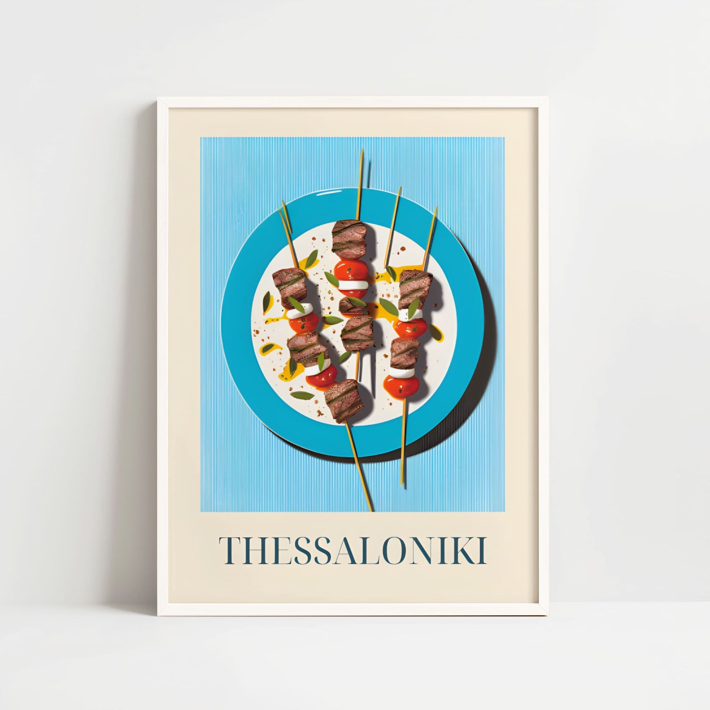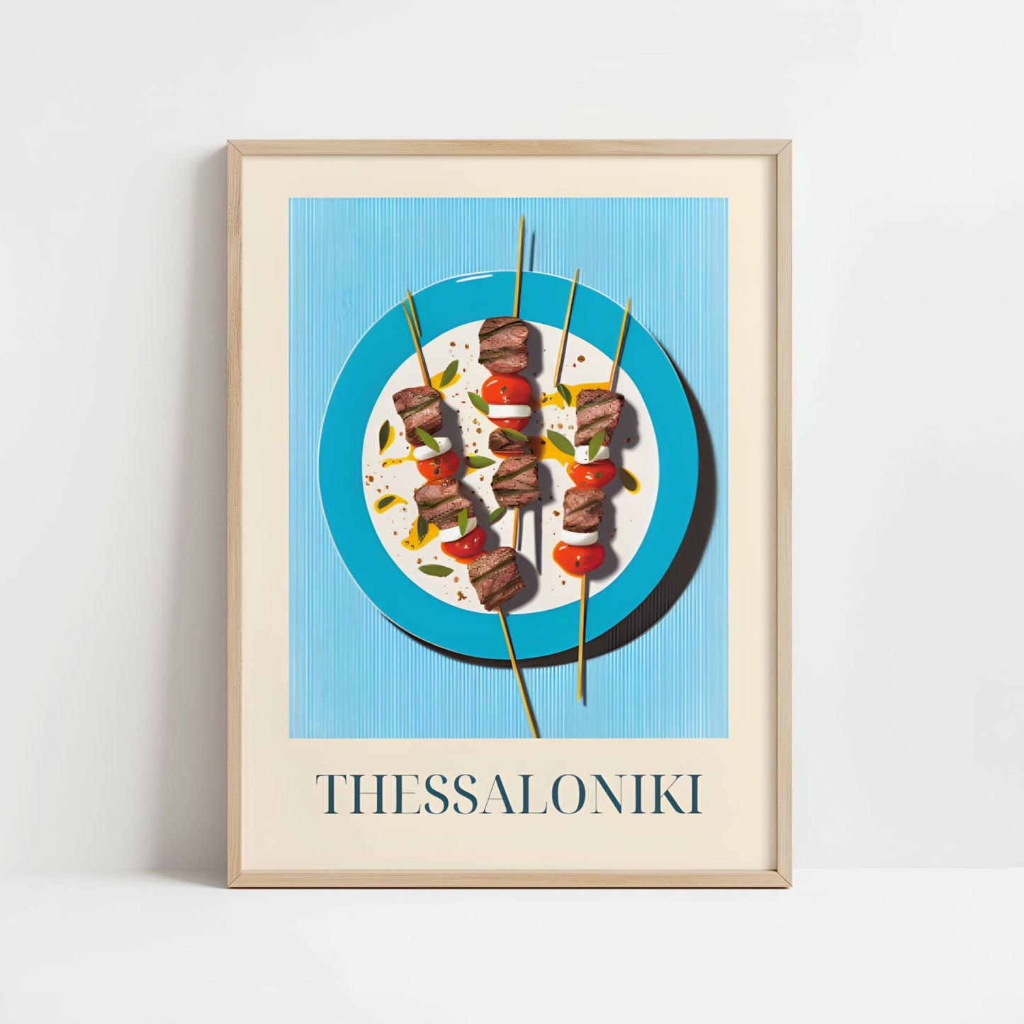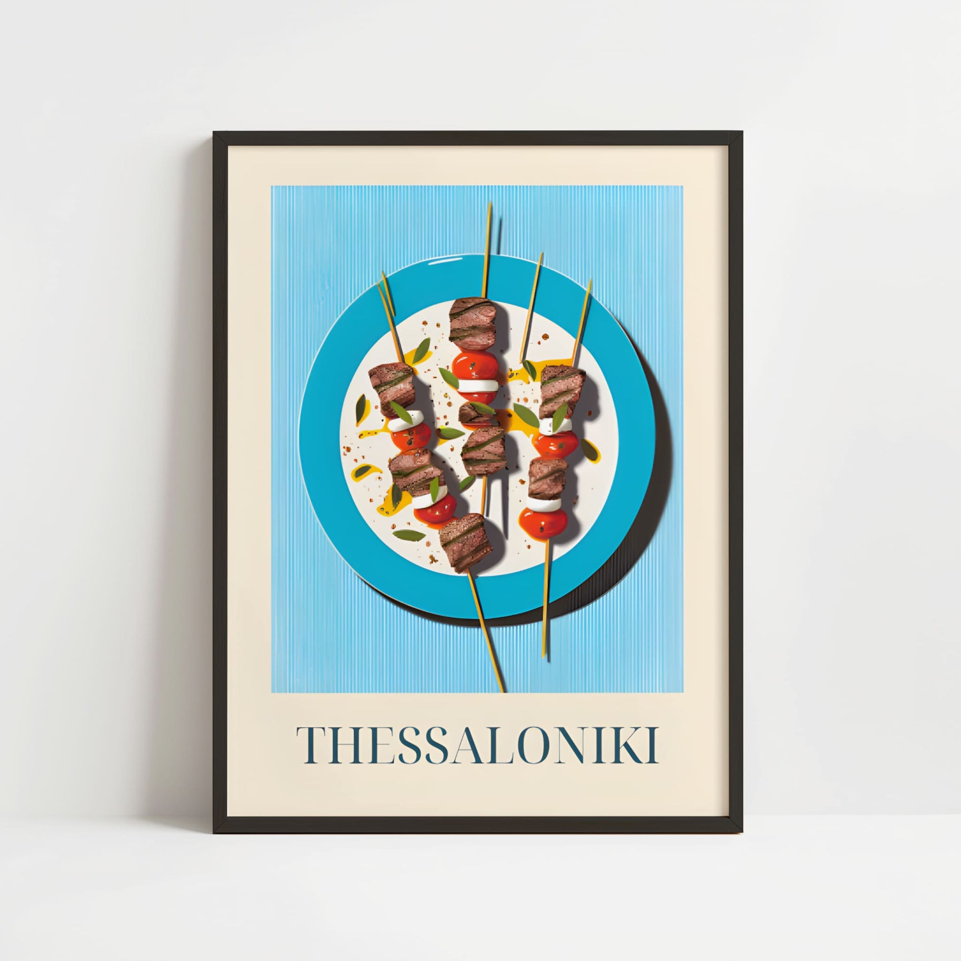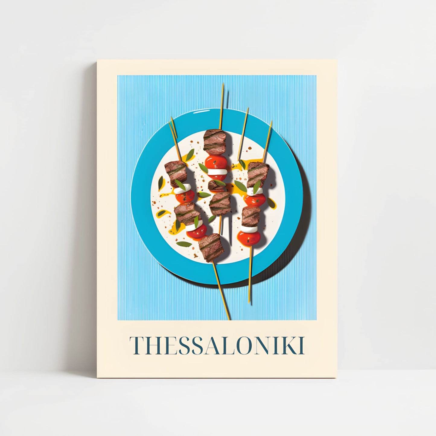 Celebrate the bold flavors of Thessaloniki with this poster featuring souvlaki—grilled, savory, and full of Greek tradition. Inspired by lively streets, seaside tavernas, and the warmth of Mediterranean life, this artwork brings the soul of northern Greece into your home.