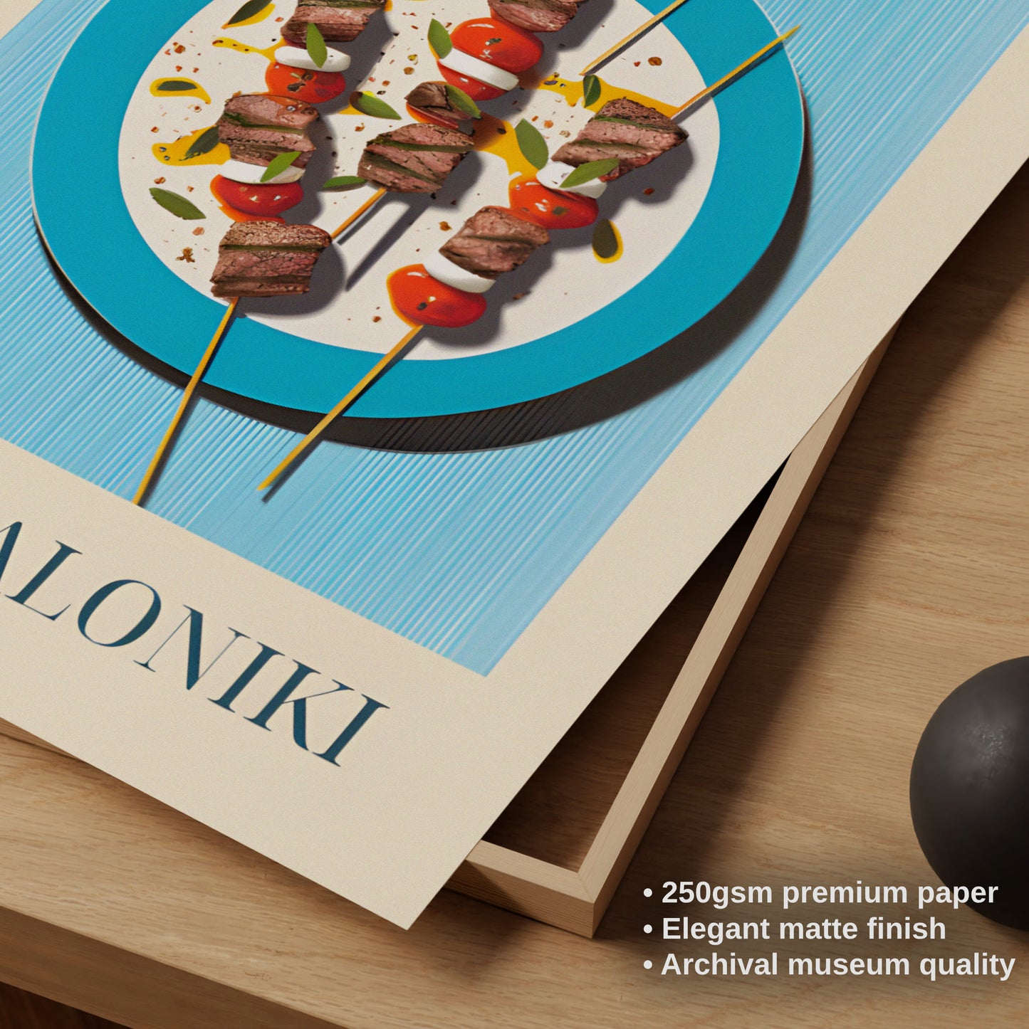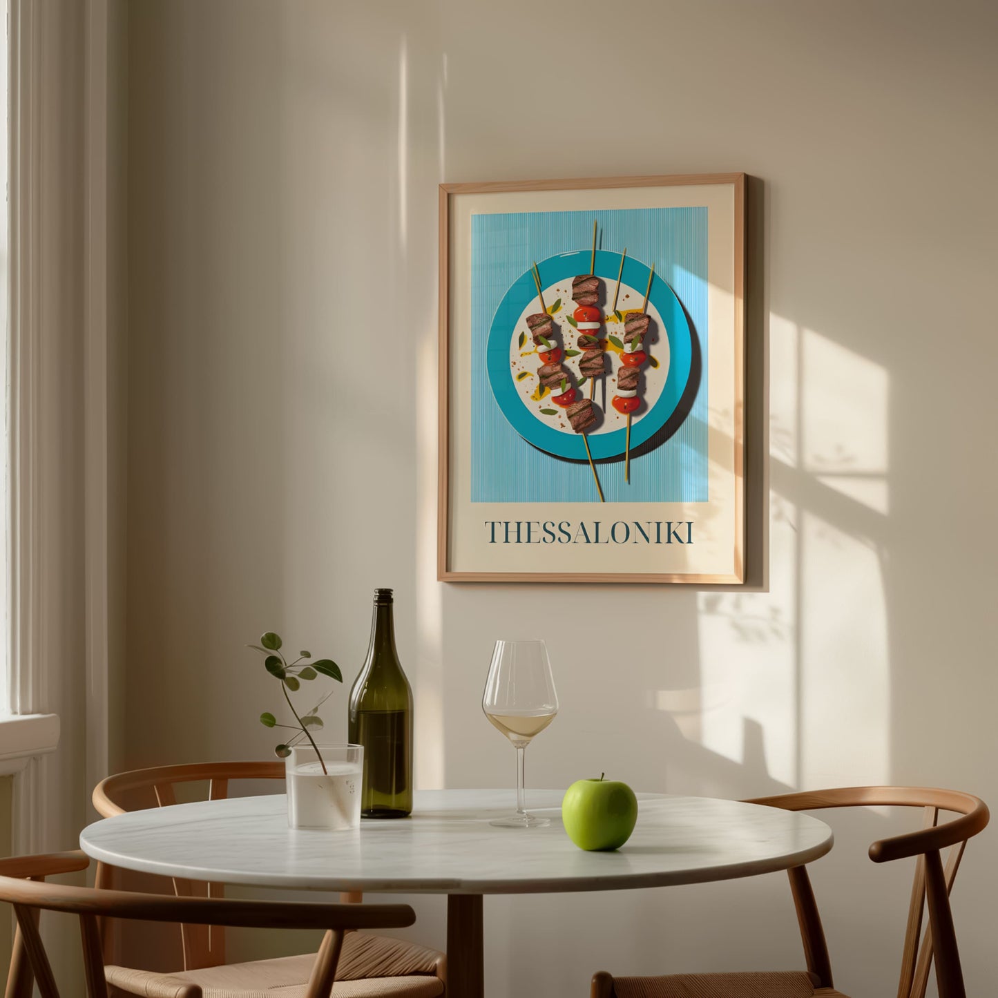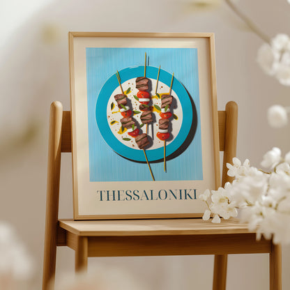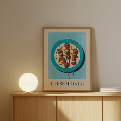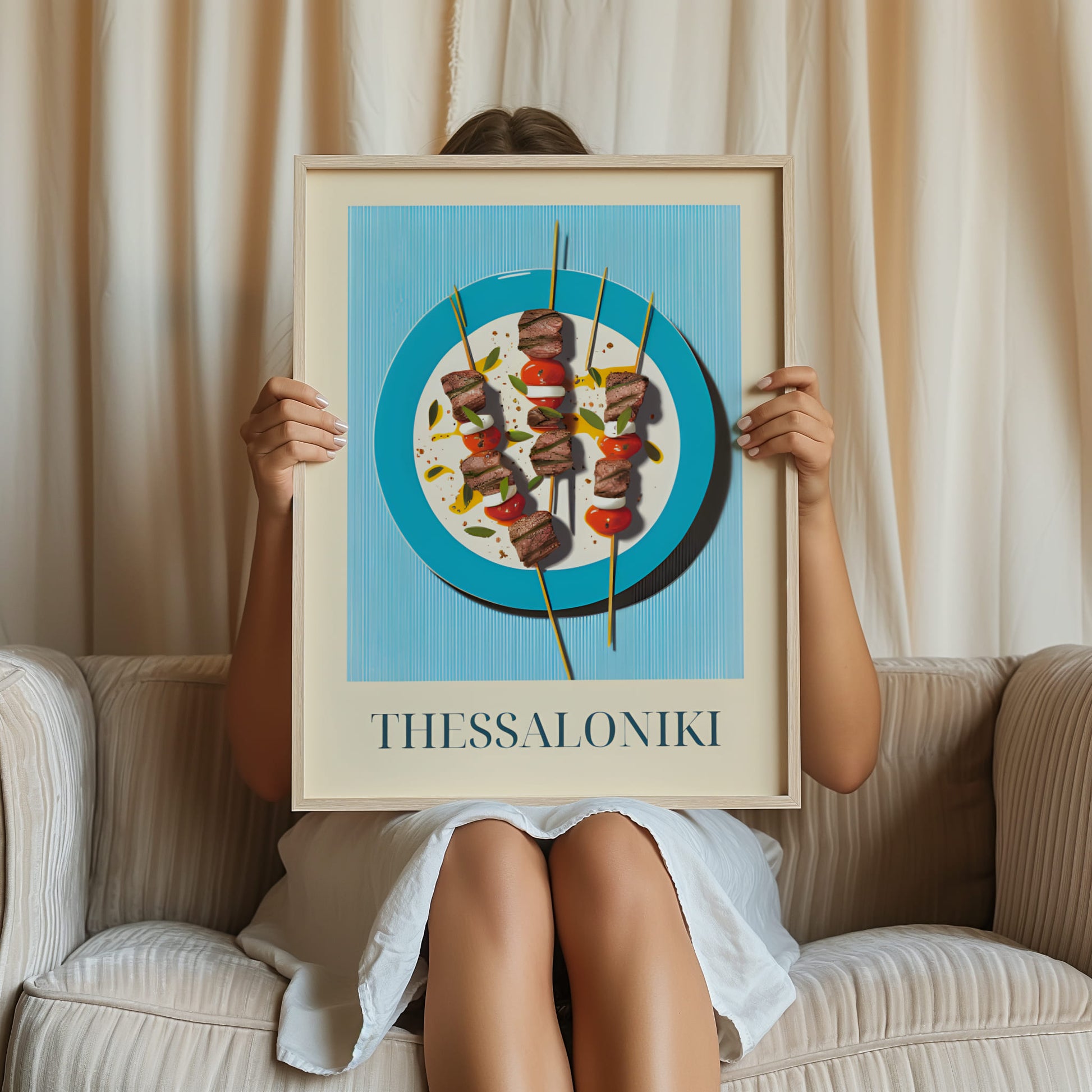Celebrate the bold flavors of Thessaloniki with this poster featuring souvlaki—grilled, savory, and full of Greek tradition. Inspired by lively streets, seaside tavernas, and the warmth of Mediterranean life, this artwork brings the soul of northern Greece into your home.