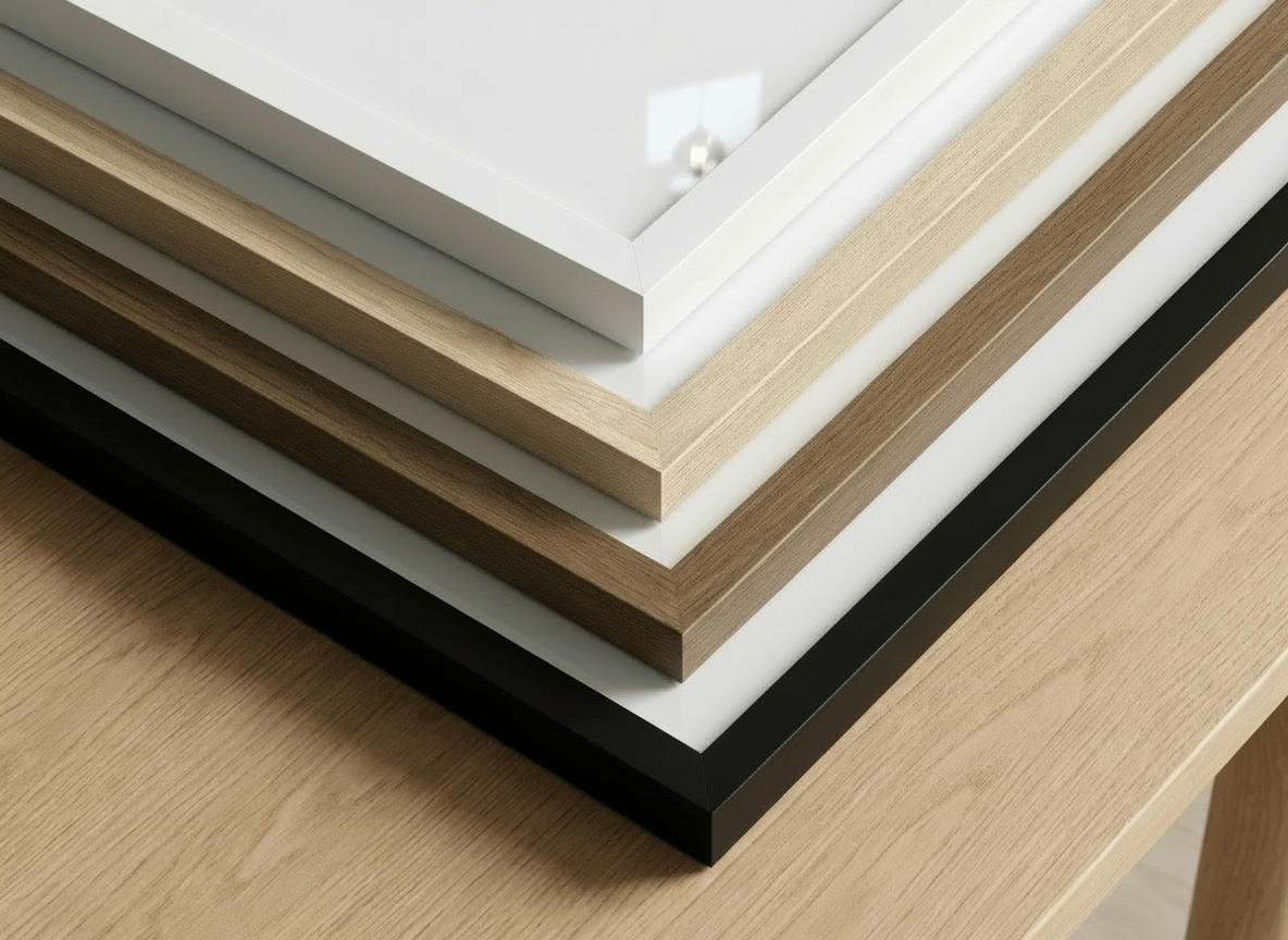 Ready-to-hang wooden frames in black, white, wood, and dark wood, crafted from durable pine with a 20-25mm thickness and 10-14mm width. Each frame includes shatterproof plexiglass, providing protection and clarity for long-term display.